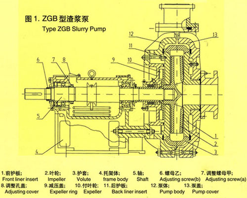 ZGB系列渣漿泵為雙泵殼結(jié)構(gòu),即泵體、泵蓋帶有可更換的耐磨金屬內(nèi)襯(包括葉輪、護(hù)套、護(hù)板等)。泵體、泵蓋根據(jù)工作壓力采用灰鑄鐵或墨鑄鐵鑄造。該系列泵均為垂直中開式,泵體有止口與托架用螺栓聯(lián)接。泵的吐出口方向可按45度間隔八個(gè)角度旋轉(zhuǎn)安裝。葉輪前后蓋板設(shè)有背葉片以減少泄漏及提高泵的使用壽命。該系列泵進(jìn)口為水平方向,從傳動(dòng)方向看泵為順時(shí)針方向旋轉(zhuǎn)。起動(dòng)及使用時(shí)嚴(yán)禁電機(jī)反方向旋轉(zhuǎn),否則,將葉輪脫落造成事故。