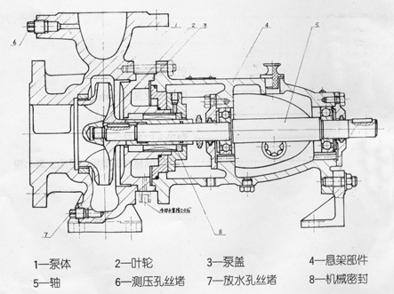 IY系列單級單吸熱水離心泵的主要零件有泵體、葉輪、泵蓋、懸架部件,機械密封部件、軸等。