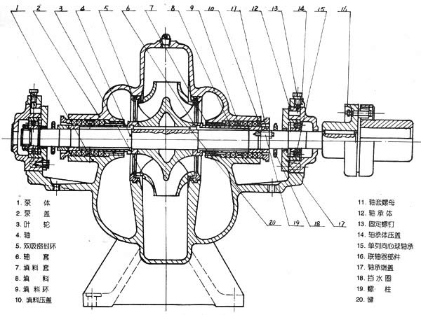 本系列泵的吸入口和吐出口均在水泵軸心線下方,呈水平方向,并與軸線垂直。泵殼中開(kāi),泵蓋用螺栓、定位銷(xiāo)固定在泵體上,無(wú)需拆卸管路及原動(dòng)機(jī)即可檢修。泵的主要零件有泵體、泵蓋、葉輪、軸、雙吸密封環(huán)、軸套和軸承等。
